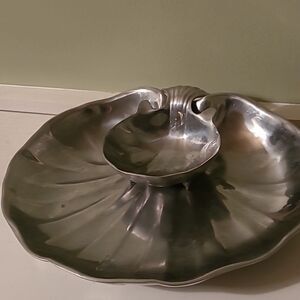 Pre-owned in good condition. The clam shell shaped dip bowl is approximately 4.5 inches wide and the platter is approximately 12 inches long . It has some signs of tarnish but is altogether os in good condition.Made of pewter.