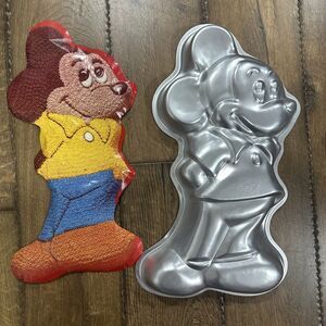 This vintage Wilton cake pan mold is a must-have for any Disney fan or collector. It features a classic Mickey Mouse design, along with a Troll character, and is made of durable aluminum material. The pan is oven-safe and easy to clean, making it perfect for baking all your favorite cakes.