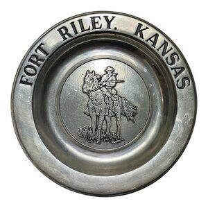 Collect a piece of American military history with this vintage Wilton metal plate, made in Mount Joy, PA. Features a raised design of a cavalry soldier on horseback, symbolizing the historic Fort Riley in Kansas. “Fort Riley, Kansas” is engraved along the rim.
