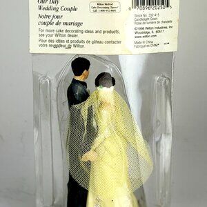 This collectible Wilton "Our Day" Wedding Couple cake topper is a charming find from 1998, designed by Ellen Williams and still presented in its original packaging. Featuring a classic bride and groom in elegant attire, the bride wears a detailed candlelight gown with painted lace detailing, a netted tulle veil, and a bouquet of yellow roses.
