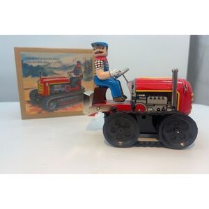 This vintage-style wind-up tin tractor features a farmer in blue overalls and a red crawler-style tractor with detailed graphics and moving wheels. The toy includes the original box with classic countryside artwork.