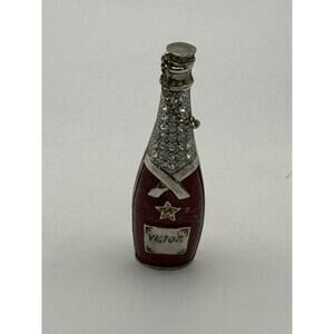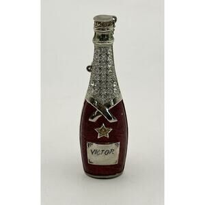 This Vintage Wine Bottle Trinket Box is a unique and stylish collectible piece perfect for any wine lover. The asymmetrical shape and small size make it a versatile piece that can be used for all occasions. Crafted from metal, enamel, and crystals in burgundy and silver tones, this contemporary trinket box features a 3D effect design with gemstones and a magnetic closure. Displaying a wine theme, this trinket box adds a touch of elegance to any room and makes for a fantastic gift for adults who appreciate fine wine and decorative items. It says "Victor" on the label. The cork comes out, but is attached with a chain. It is in excellent condition with no missing crystals.