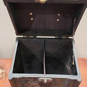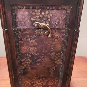 Vintage 2 bottle wine case. wooded with looks to be an aluminum overlay. Brass handle and hardware. Latch is missing a screw ( see photos)but still operable. Some bumps and bruises from being used. Beautiful piece for use or display. Sorry, bottle and glass not included.