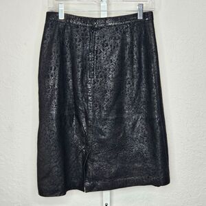 Stunning vintage genuine leather skirt by Winlit, made in the Dominican Republic. This black midi-length skirt features a unique embossed geometric texture and a sleek satin lining for comfort. It has a subtle slit in back for movement and a structured silhouette that flatters the figure. A standout piece that brings a touch of 90s edge and timeless sophistication to any wardrobe.