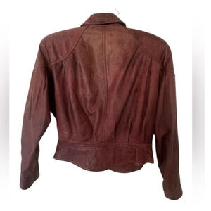 Gorgeous vintage 1980s burgundy leather wrap jacket with a flattering belted waist and signature 80s power-shoulder silhouette. Soft genuine leather with a rich aged patina that gives it the perfect vintage look.