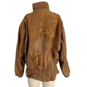 Features: 100% genuine leather fabric outer. Lined inner. Ornate details throughout. Oversized bomber style fit. High neckline. Smocked bottom hemline. Pockets. Long sleeves. Zip closure.