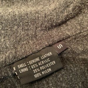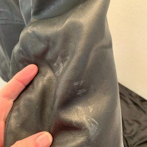 Buttery soft leather jacket closes with a zipper and has a hood and 2 pockets. Pre-owned, the right sleeve has a section about 4: long where a little of the color is rubbed off. Please see pictures. My mannequin is a size 4 for reference, please see measurements for fit. Acrylic & polyester lining. Other than the color spot on the sleeve, it's in very good condition.