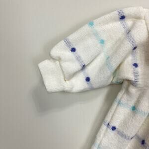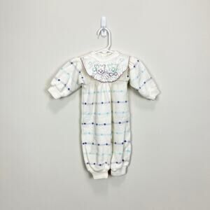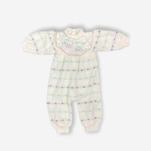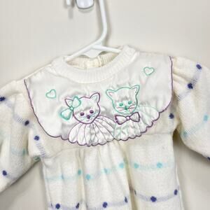Vintage Winnie the Pooh Sweater Jumpsuit. Baby girl size 12 months. Ivory white one piece romper outfit with pastel purple and green stripes. Fun bib collar with embroidered cats. Missing one button but looks to function fine without.