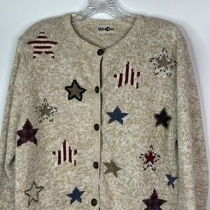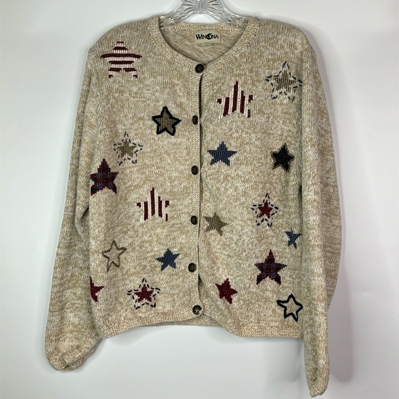 Vintage Winona Cotton Embroidered Star Oatmeal Tan Button Sweater Large