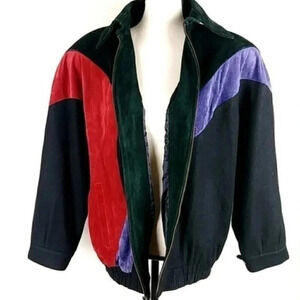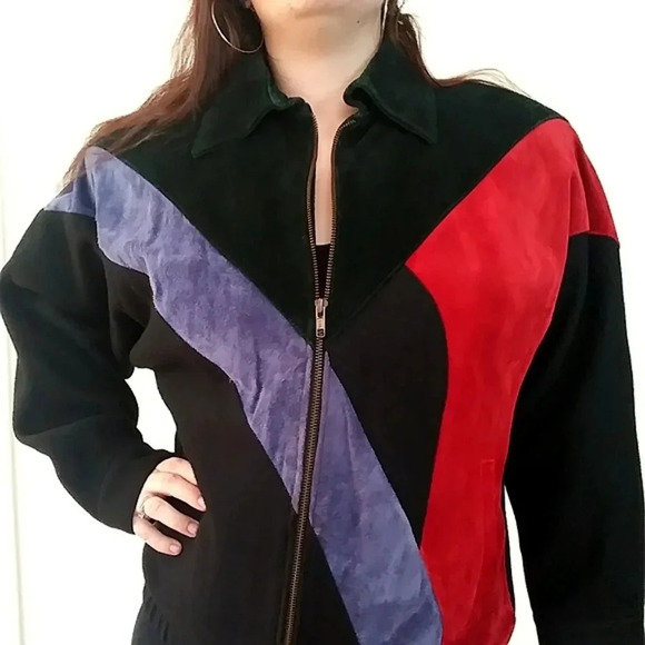 Beautiful Vintage 80's Colorful 100% Genuine Suede Leather and 100% Wool Color Block Zip Up Heavy Winter Coat. This is a Throwback to the 80's Baby with Heavy Padded Shoulders! Size Medium, Zip Up, Lined Inside. Colors area Deep Dark Hunter Green, Black, Red and Purple. Great Vintage Condition, Some Fabric Wear Due to Age (Suede Pilling/Fade Marks) Not Very Noticable When Wearing. Smoke Free Home, Fast Shipping!