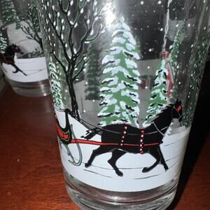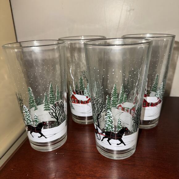 Vintage Winter Snow Red Log Cabin Sleigh Christmas Glasses Set Of 4