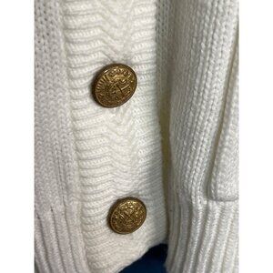 Soft knit cardigan with decorative metal buttons and front pockets. Comfortable, versatile, and ideal for layering in cooler weather.