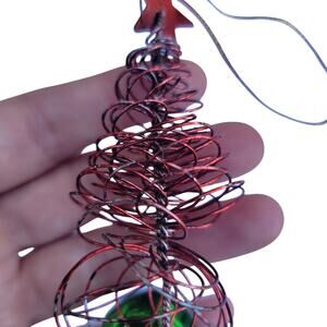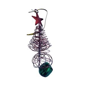 This whimsical vintage Christmas ornament from the 1990s features a coiled red wire in the shape of a stylized Christmas tree, topped with a metal star and finished with a large green jingle bell at the base. Lightweight and full of rustic charm, this handmade-style ornament evokes country Christmas flair with a minimalist twist. Perfect for farmhouse trees, retro holiday décor, or collectors of unique wire and metal ornaments.