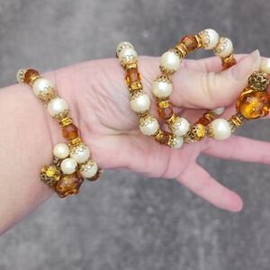 This is absolutely gorgeous and the amber color stones are glass..not plastic.