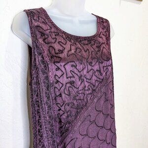 FEATURES/ACCENTS: Magic Made in India round neck, Rayon, sleeveless, maxi length, tunic style shift dress. Various embroidered designs over deep purple tie dye lightweight rayon. Pull on with waist ties at back.