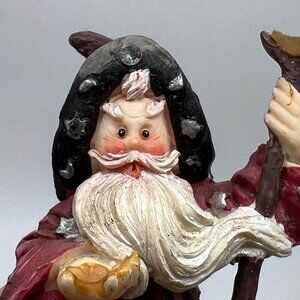 Pair of 90s wizard figurines, each in colorful starry robes with long beards + staffs. Both originally held crystal balls, which are missing; still great for display, crafting, or fantasy-themed decor.