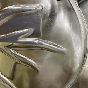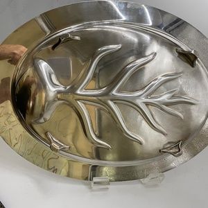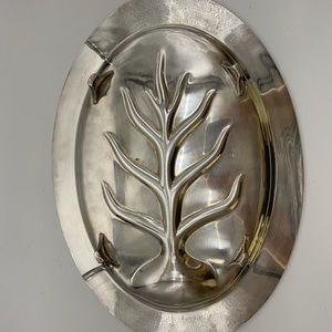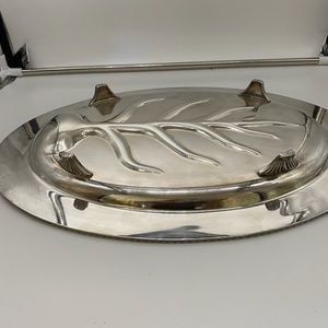 My grandmothers Mid Century classic footed beaded border silver-plated WM Rogers Avon,#3610 Meat Tray. The model is #3610, Avon.. mark is stamped on bottom of tray I think the design is called Tree of Life and it has been in the family since prior to 1980.. Im writing produced in 1970's but it may be older.. It is a classic style, works with any china and serving dishes. A little tarnish but no oxidation. No dents or damage. There are a few scratches in the well (where the meat and juices should cover) on the front of the tray from use. This is the 18'' model that accommodates a large roast, up to a small turkey. It is a sturdy piece that will support a heavy entree. My dimensions are approximate 18 ' Long X 13" Wide X 1 3/4" H.