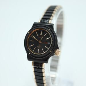 Vintage Womans Seiko SQ Sports 100 Watch Black Gold Arabic 2A23-0069 New Battery