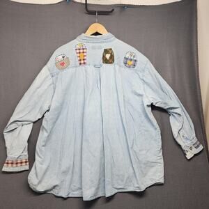 Vintage Women Denim Shirt 3X Patchwork Applique Chambray Country Cottage Folk