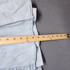 Condition: Light wear with minor signs of use. Faint discoloration/spotting noted on the front near the lower left hem and another light mark on the front panel (see photos with fingers pointing). Typical wash fade for light denim. Cuffs show mild wear; appliqués and stitching intact. All buttons present and functional. No holes or tears observed.