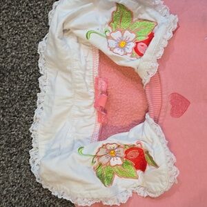 Cute pink sweatshirt featuring a strawberry design. Adorned with a unique collar.
