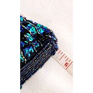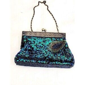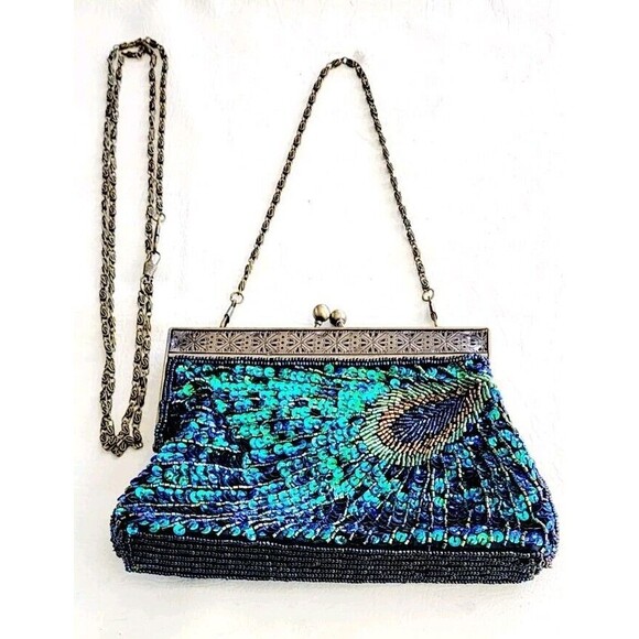 This is a vintage handmade evening clutch bag featuring intricate beaded and sequin accents in a peacock theme. The bag has a kiss lock closure, gold hardware and handle/strap, and a detachable chain strap for versatile styling. It is small in size, with a multicolor exterior and a black fabric lining. Ideal for weddings, parties, formal events, or business functions.