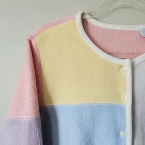 Vintage Women Pastel Patchwork Fleece Jacket Cardigan M Cozy Granny Cottage