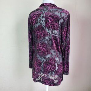 Vintage Women Size Med Petite Purple Velvet Floral Semi Sheer Long Sleeve Blouse