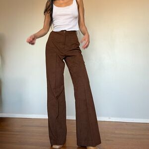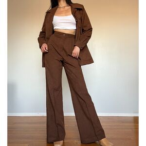 Chic vintage 1970s two-piece pantsuit in a rich chocolate brown. Includes a wide-leg high-waisted trouser and a matching collared jacket with a structured yet relaxed fit. Tag reads size 10 but fits more like a modern size 4–6 (please check measurements).