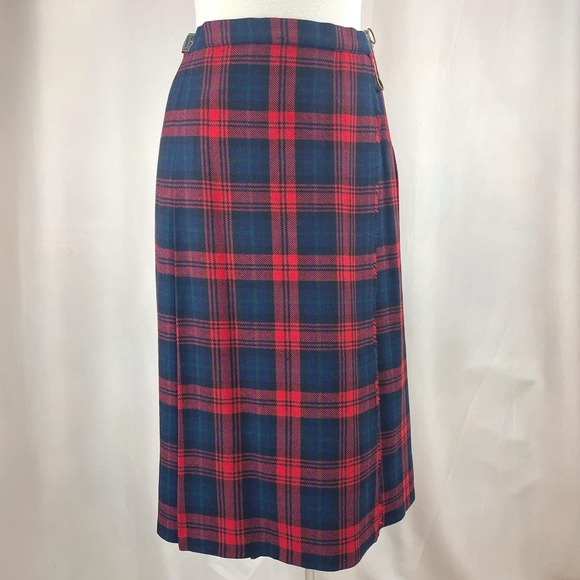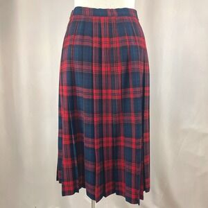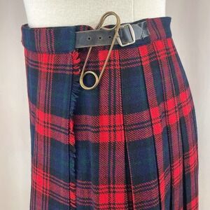 Vintage 80s Womens (30") Kilt Wool Plaid Pleated Wrap Skirt Red Blue Midi UK Trad Old Money