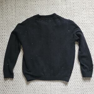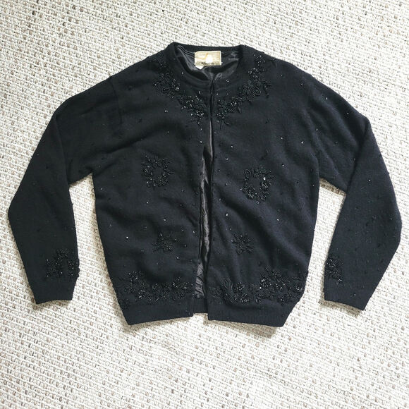 Vintage Womens 38 Lambswool Angora Cardigan Sweater Black Beaded Sequins