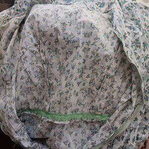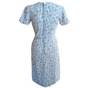 A delicate vintage dress that whispers stories of mid-century elegance, crafted with a soft cotton fabric adorned in subtle blue and green floral print. The dress features a cinched waist, creating a flattering silhouette, and short sleeves that add a touch of feminine charm. Perfect for those who appreciate nostalgic fashion with refined simplicity.
