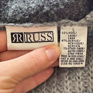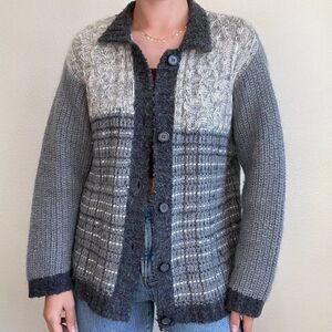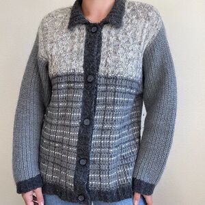 Vintage Womens 80s Wool Blend Gray Chunky Knit Geometric Cardigan Sz L