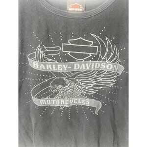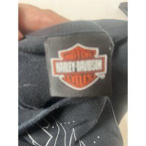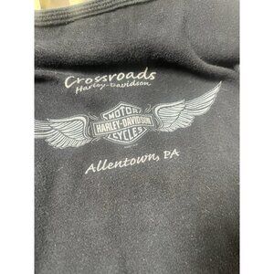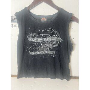 The product is a vintage women's Harley Davidson tank top shirt from Allentown, Pennsylvania. Made of black cotton with a sleeveless design, round neckline, and regular fit, this size L shirt features a solid pattern and is branded as vintage. The basic style of the tank top makes it a versatile addition to any woman's wardrobe, perfect for casual wear and showcasing a touch of vintage charm.