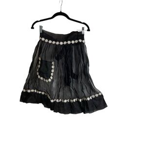 vintage-style black apron sheer black with white floral trim along the hem and waistband, as well as outlining a pocket. Elegant black vintage apron with charming floral trim. Perfect for any occasion.