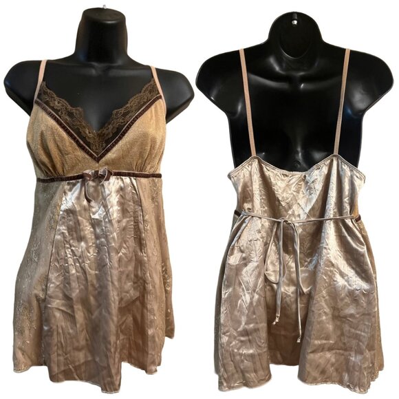 This Vintage Women's Babydoll Tank Top a boho festival piece from the Y2K era. It features a V-neckline, pullover closure, and a knit fabric type with ruched, embroidered, and lacy accents. The gold camisole-style top is perfect for party or casual occasions, with adjustable straps and a stretch fit. Made of a blend of polyester, nylon, and cotton, this hippie-inspired top embodies a fairy, angel, and bohemian theme, making it a unique and stylish addition to any wardrobe. Brand is Heart Soul
