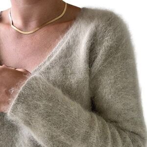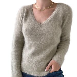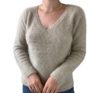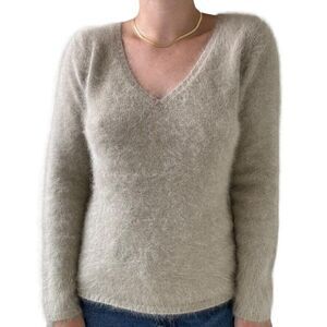 Vintage Womens Banana Republic Tan Angora Fluffy Soft Sexy V Neck Sweater Sz M