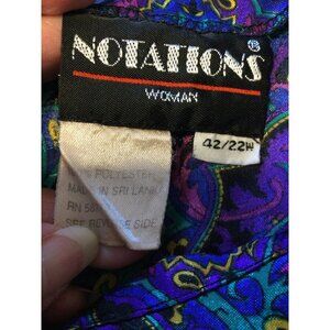 This vintage Notations blouse captures the essence of a bygone era with its exquisite kaleidoscope paisley pattern. Gold button accents on the shoulder add a touch of elegance. A classic blend of vibrant colors and design, this piece is a nostalgic nod to timeless fashion, perfect for those who appreciate retro styles.