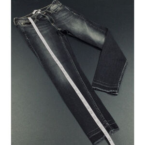 Pre-owned Calvin Klein Ankle Skinny jeans, size 4, in black. Made in Bangladesh. Measurements: Inseam approximately 26 inches, waist approximately 13 inches. The jeans show some signs of wear consistent with previous use. The fabric has a faded appearance. No significant rips or tears are visible. They are in perfect vintage condition