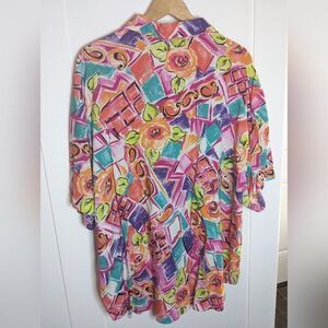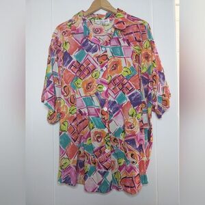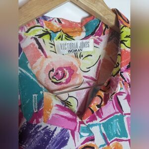 Vintage Women's Casual 80s Pattern Linen Button Up Shirt Short Sleeve Victoria J