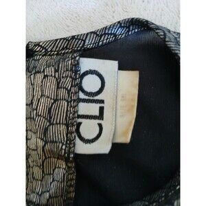 This vintage women's Clio blouse is perfect for special occasions or casual wear. The blouse is made of 100% polyester and has a metallic silver and gold color. It features short sleeves and a disco look. The blouse is available in size S/M and is suitable for regular size types. The blouse is an original piece from the 1990s and has not been modified. It is personalized and has been manufactured in the United States.