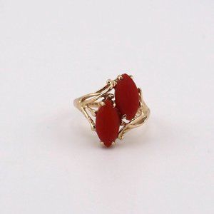 This is a beautiful vintage 1990's 14k Solid yellow GOLD ring for women, verified & tested. 14k Gold band with twin natural coral stones. Classic design. Marked on inside of band.