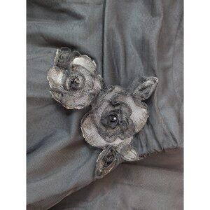 Features delicate ruched detailing, sheer overlay skirt, and chiffon flower appliqués at the bust and waist for a romantic vintage touch. The A-line silhouette flatters the figure while offering comfortable movement.