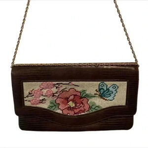 Vintage Womens Embroidered Needlework Butterfly Purse Shoulder Bag Leather. This purse is pre-owned. Great co fiction. No flaws. Measurements: 11 inches wide 7 inches tall adjustable handle drop 1 inch deep