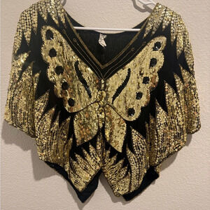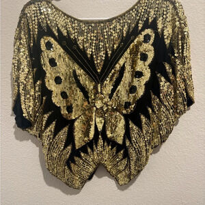 Vintage Women’s Exclusive Black and Gold Sequin Butterfly Top Size M. Good condition.
