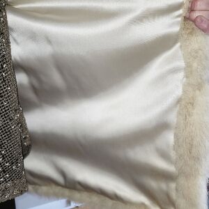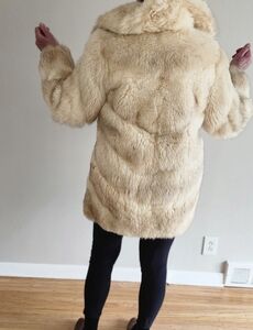 Vintage Luxurious fox fur coat for a sophisticated look. This garment was sent to a furrier for cleaning and is in mint condition, except for a stain on the inside lining and I have included a photo which shows that the stain is smaller.Then the size of a quarter. This coat has been in storage and it's now time to go to a new owner. The garment does have the name of the original owner embroidered on the inside lining. There are no bare spots and has been lovingly taken care of. pit to pit -22" shoulder to cuff 23" length 31"