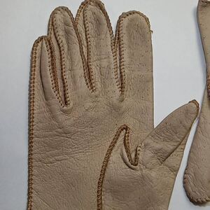 These vintage women's gloves are a rare find, crafted from genuine deerskin and handstitched with meticulous detail. The size 6 1/2 suggests a snug fit for smaller hands. This luxurious accessory not only offers exceptional quality but also reflects a timeless elegance. Perfect for adding a touch of vintage sophistication to any outfit, these gloves are both stylish and functional, providing warmth and comfort during cooler weather. Ideal for collectors or anyone who appreciates fine craftsmanship and unique vintage pieces.