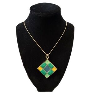 This vintage women's necklace features a gold tone metal and enamel pendant with a coastal blue retro chic design. The square-shaped pendant hangs on a 24-inch gold tone snake chain and has a lobster closure. The pendant is approximately 2 inches.