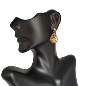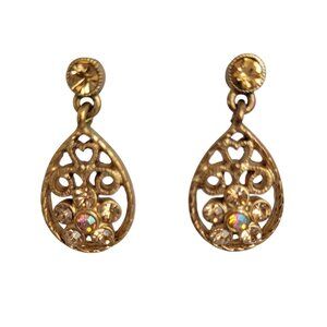 Vintage Womens Gold Toned Floral Rhinestone Tear Drop Dangle Pierced Earrings