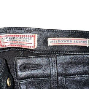 Vintage Women's Guess 1981 Power Skinny Faux Leather Pants Size 24. These pants are made from 70% Rayon and are Dry Clean Only. These jeans are in good condition. They have some creasing but do not have any holes, stains or tears. Ships from a Smoke Free Home. Measurements: Rise 10" Inseam 25".